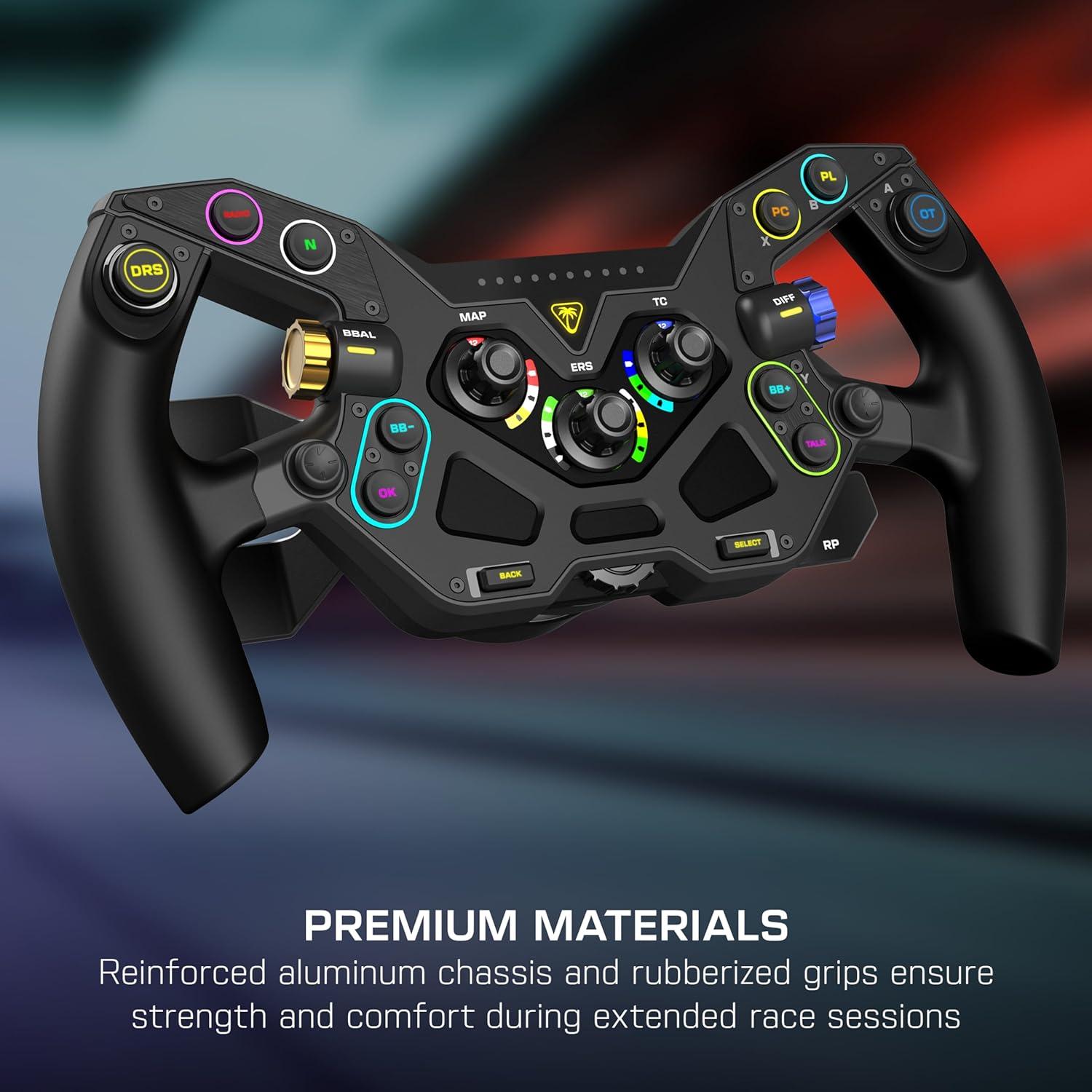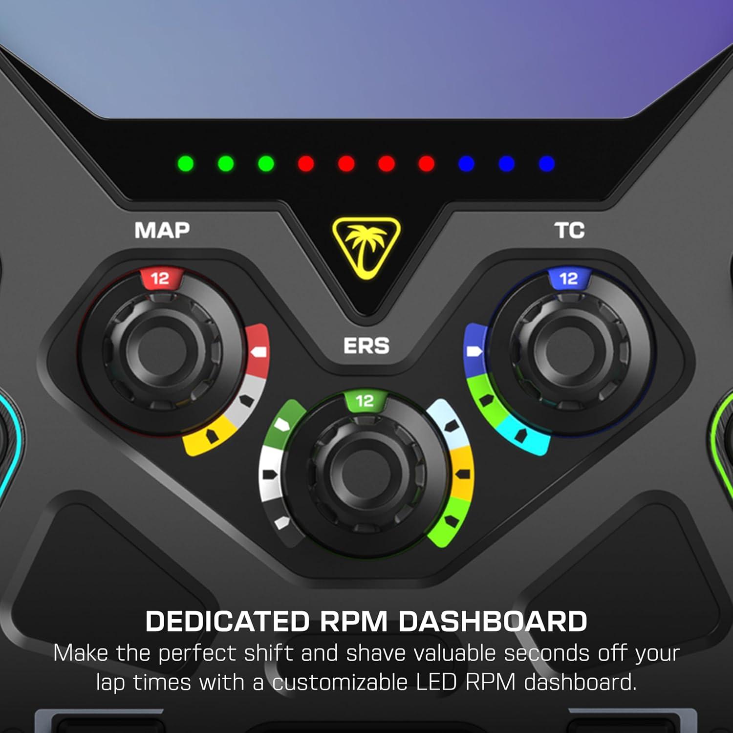 Command the track with the Turtle Beach® VelocityOne™ F-RX formula wheel for VelocityOne™ Race & VelocityOne™ Race KD3 Wheelbases, compatible with Xbox Series X|S, Xbox One & Windows PCs. Featuring a premium design and loaded with true-to-life features, the VelocityOne™ F-RX puts you in the driver’s seat of your favorite formula racing titles with immersive control. Ten mechanical switches with RGB backlighting are ergonomically placed for quick access, giving the F-RX wheel an ultra-realistic feel and superior performance. Glide through the gears with precise, fast shifts thanks to two magnetic paddle shifters, plus a dedicated LED RPM dashboard ensuring you time every shift exactly right. Located below the two magnetic gear shifters are two hall-effect clutch paddles featuring tunable bite points so you can dial in sensitivity for lightning-fast launches and quicker shifts. Five rotary dials are intuitively placed on the wheel for quick in-race adjustments to critical car functions like brake balance, differential control, traction control and engine mapping. A reinforced aluminum chassis provides durable, lightweight performance, and rubberized, non-slip materials ensure a comfortable, non-slip grip over extended race sessions. Lastly, a quick-release collar design with universal contact points makes the VelocityOne™ F-RX compatible with any VelocityOne™ K: Drive wheelbase.